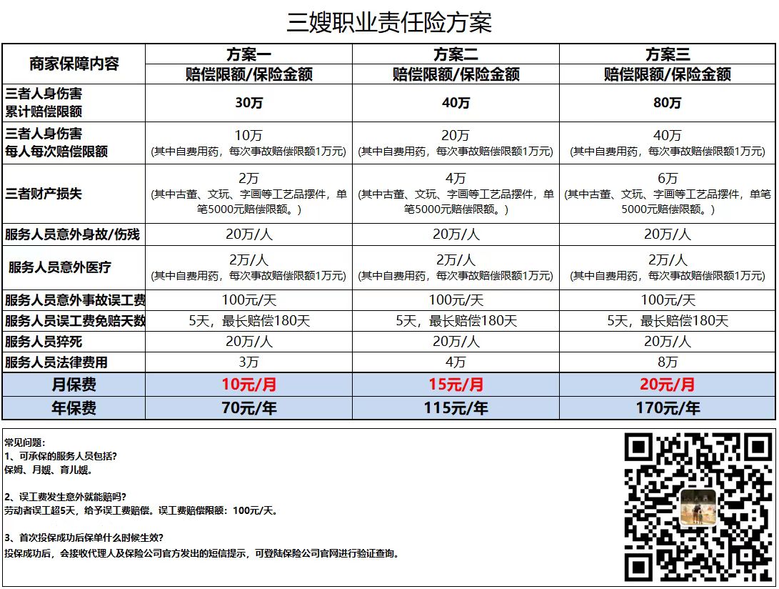 服务人员意外身故/伤残 20万/人 20万/人 20万/人