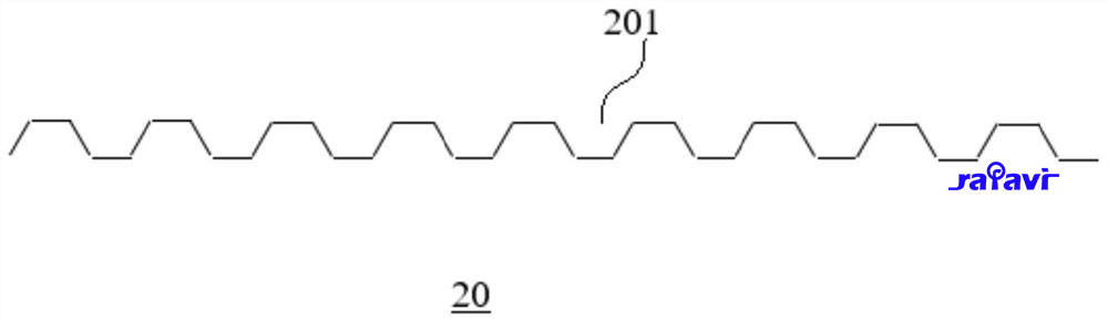 进一步地,如图4所示,散热件20沿第二方向延伸,散热件20上形成有多个安装槽201,相邻两个安装槽201的开口方向相反,每个电池10位于对应的安装槽201内。每个安装槽201的形状与电池10的壳体1的形状相适配,以使壳体1的侧壁与安装槽 201的侧壁贴合,从而可以使电池10上的热量能够快速传递至散热件20上进行散热,以降低电池10的温度,保证电池10的正常工作。