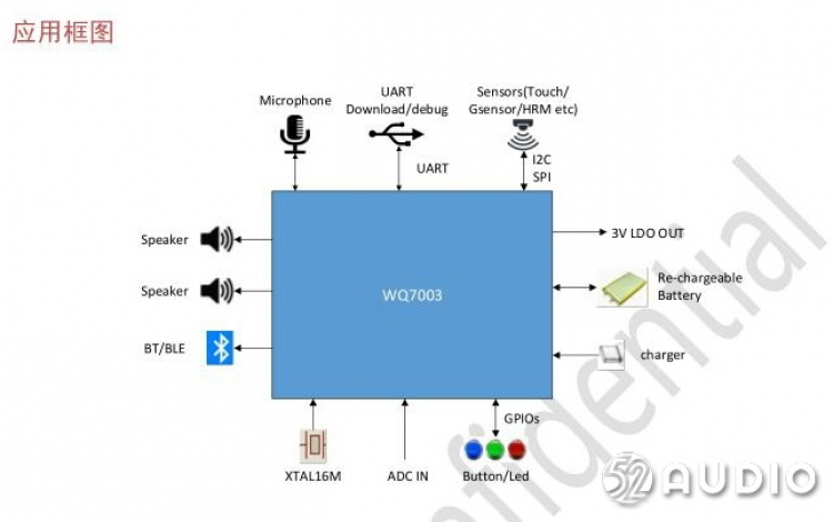6、内置音频解码器:CVSD/mSBC/SBC/AAC/WHDA(物奇高清晰音频解码器)。7、高集成度PMU,灵活的低功耗管理策略。