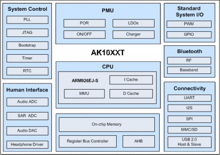 AK10T系列处理器采用ARM926EJ-S内核,内置RAM,终端产品无需外挂RAM类型存储器。AK10T系列处理器集成蓝牙收发器(射频电路+基带电路)、电源管理电路、音频ADC/DAC、USB2.0高速主从控制器、MMC/SD控制器以及其它丰富的功能模块和接口,具有很高的集成度,大大简化了终端产品的设计复杂度,降低了产品成本,提高了产品可靠度。基于AK10T系列处理器,安凯提供完整的产品开发包。基于此开发包,客户可以快捷、高效地完成产品开发。