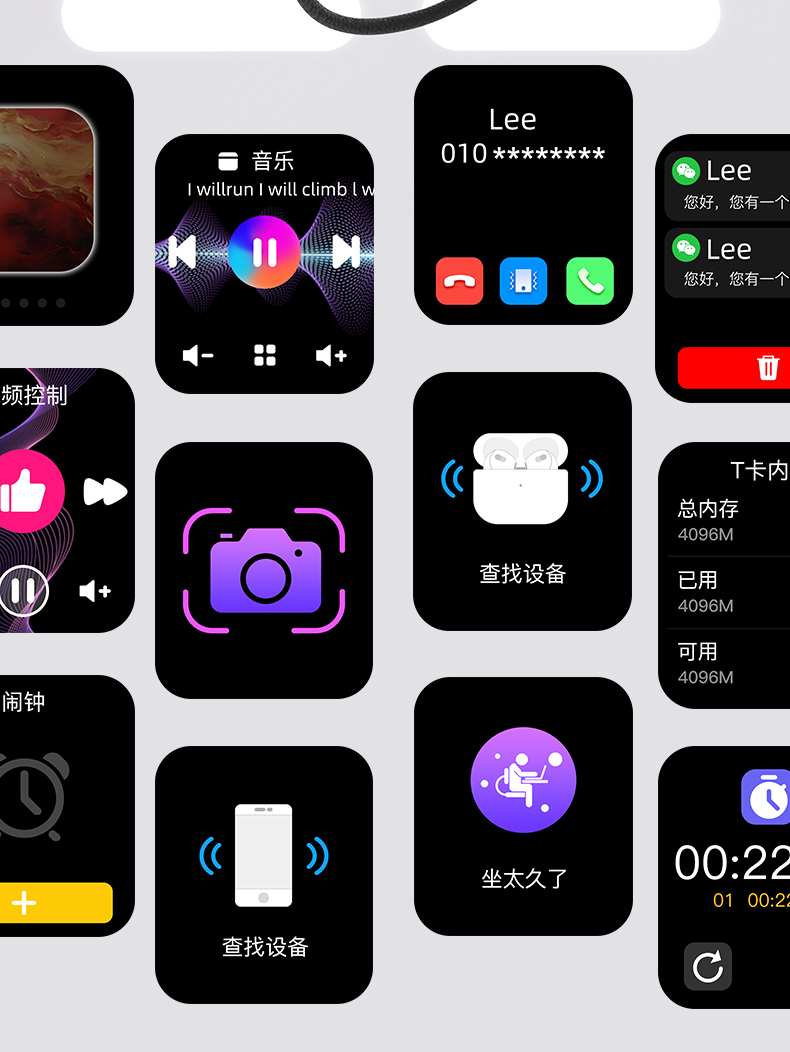 8.信息显示:信息提醒,短信和电话都可用。随时随地查看;