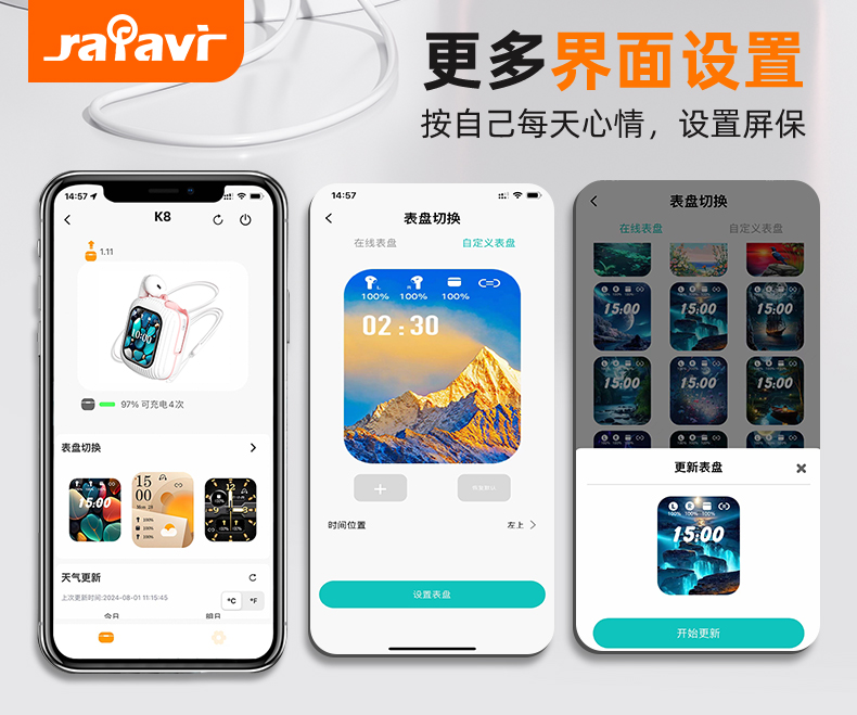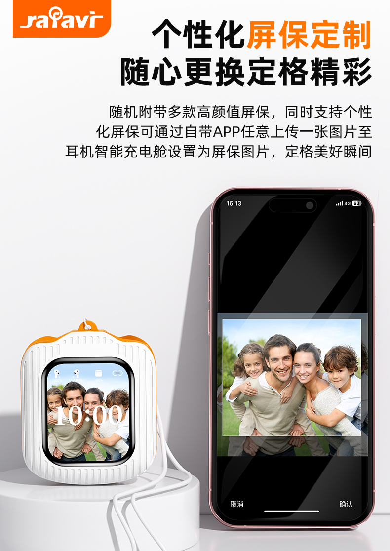 7. 个性化屏保:自带多种屏保,支持手机本地相册图片。并且支持将图片上传到耳机充电仓以设置为屏保。