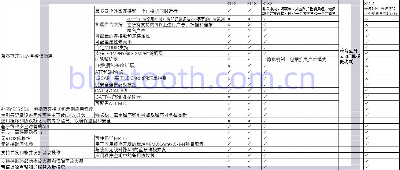 部分 Nordic Softdevices 特点对比表: